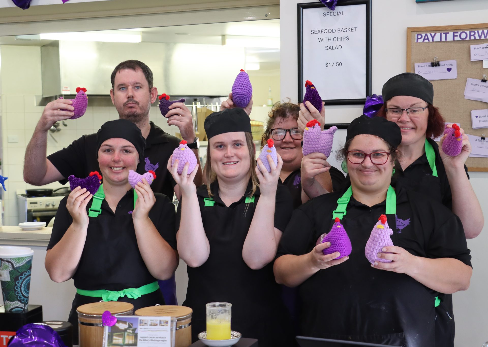 The Purple Chicken Cafe, established in October 2019, has always focused on skill development, empowerment, and giving back to the local community. Jen called a meeting with the café’s team to decide what to do with the generous donation, and the decision turned out to be quite easy. “We’re going to pay it forward,” they agreed. “We’ll sell the purple chickens and donate the proceeds to the Cancer Centre Trust Fund. They are local, and we all know someone affected by cancer.”